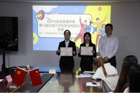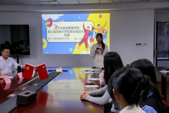20251017下午,太阳成城集团在经管大楼1101会议室成功举办第三届全国大学生职业生涯规划大赛院赛,本次比赛由红育英辅导员工作室承办。学院党总支书记吴小平、副书记杨燕,以及学院学生科干事、辅导员出席了此次比赛,18 名选手参赛,各班学生代表也到现场观摩学习。