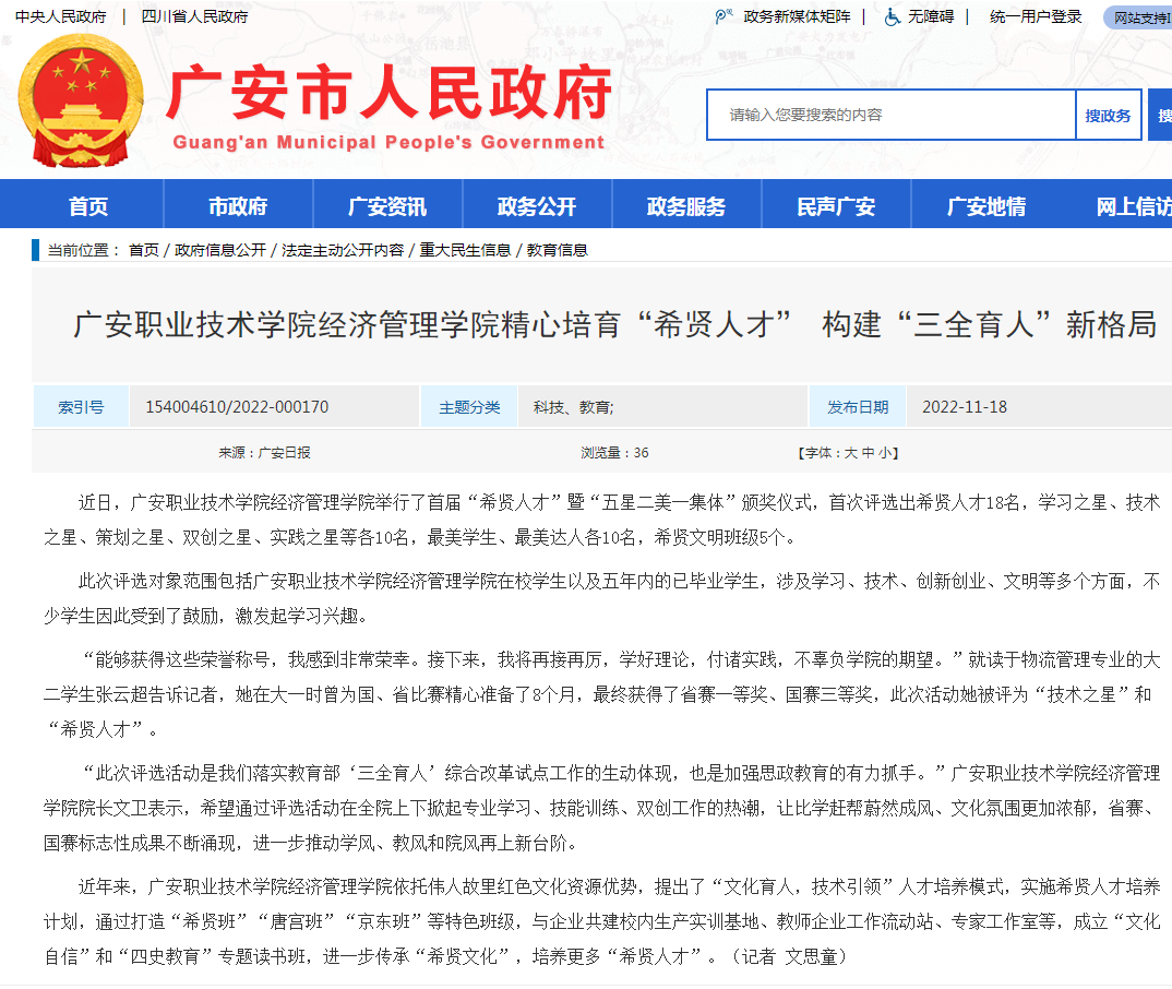 广安市人民政府:太阳成城集团经济管理学院精心培育“希贤人才” 构建“三全育人”新格局