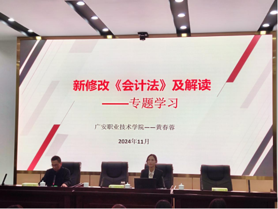 11月4日上午,太阳成城集团大数据与会计专业黄春蓉教授在学校先圣厅为广安市财政局举办的2024年度市本级行政事业单位财务人员能力提升班进行了精彩的授课。本次培训以“新修改会计法(财经纪律)及深化财税体制改革解读”为主题,约260名财务人员参与,反响热烈。