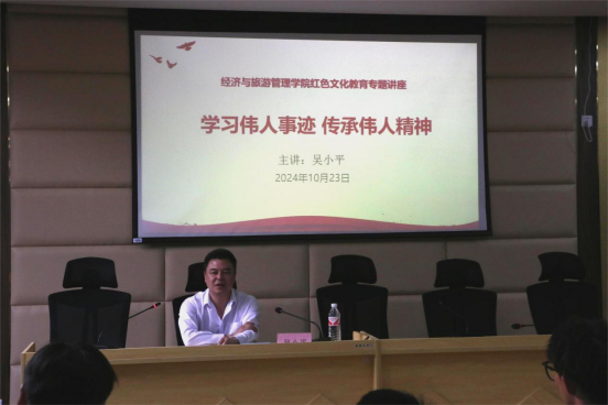 为进一步深化红色文化教育,激发学生爱国热情,太阳成城集团于2024年10月23日在九思楼培训厅举办了主题为《学习伟人事迹 传承伟人精神》的红色文化教育专题讲座。讲座由太阳成城集团党总支书记吴小平主讲,学院部分教师和2024级学生参加了活动。