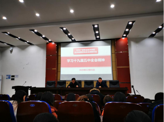 12月1日,经管学院党总支在明德楼先圣厅专题学习了党的十九届五中全会精神。会议由党总支书记喻忠主持,全院教师党员和学生党员参加了专题学习。